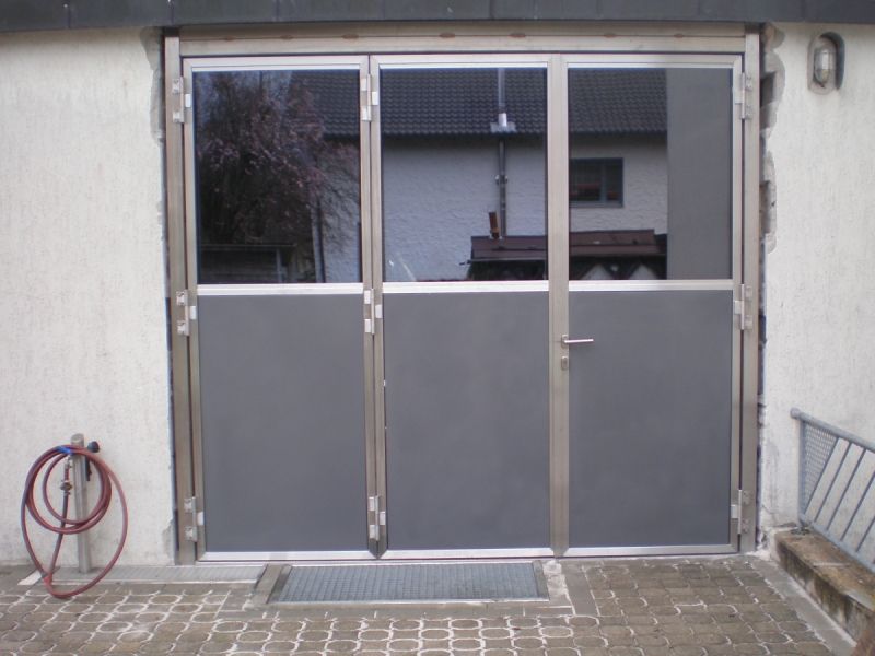 Flügeltor in der Garagenrückwand Edelstahltor mit Durchgangstüre für die Durchfahrt aus der Garage in den Innenhof.